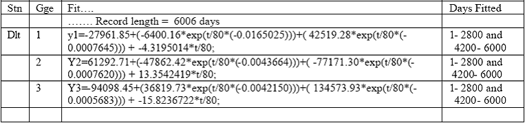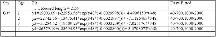 GAT—Garin— Raw, exponential models, and residual plots for each measured channel are shown for gauge 1, gauge 2, gauge 3, and for gauge 4