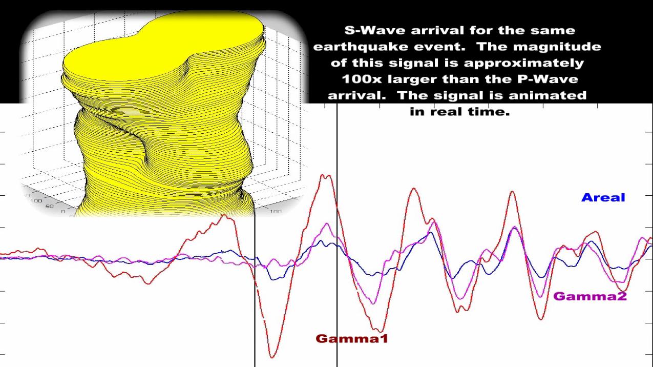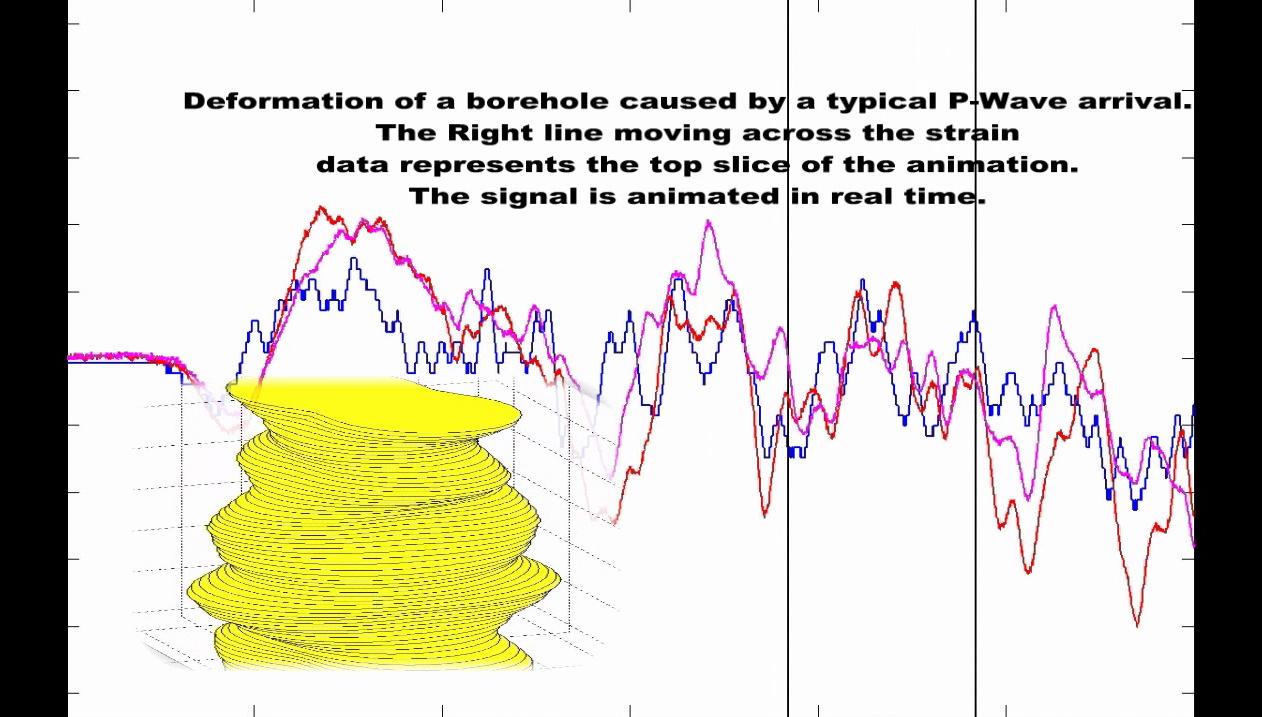 Earthquakes are an ideal strain event to allow the representation of deformation in real time. The "Earthquake Deformation Animation" shows a typical earthquake during the 2 predominant arrivals, the 'P arrival' and the 'S arrival'. They are are animated independently due to the differing signal magnitudes. The file is 2 min and 44 sec in duration and is 90.6MB. The file format is a WMV.