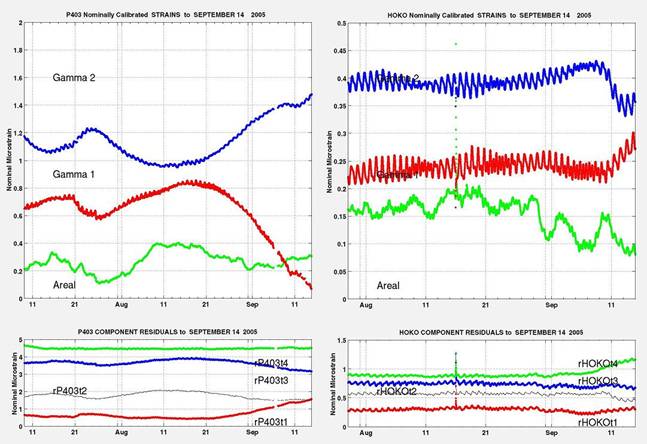 AUGUST SEPTEMBER 2005 A Cascadia silent slip event was expected late in August 2005. this event was observed at P403 and Hoko (B004) sites, see Location Map of sites. The event initially propagated through P403 in late August, and a second cycle was observed to begin at the HOKO strainmeter site around September 9. The total duration recorded to September 15 being about 18 days. Examples from the record are shown below. JUNE 2005 An early start to a new era of PBO/GTSM borehole strain meters. With the grout only five hours old we had our first event in Northern California, the M7.2 of 02:50:54 on June 15, 2005, located 140 km west south west of Cresent City.