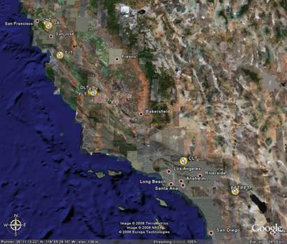 · CHT and GAT are situated in the East Bay region of San Francisco Bay. · SJT is close to San Juan Bautista to the south of San Francisco · EDT, FLT and DLT are situated in the Parkfield region of central California · PFT instrument is situated in Southern California, in the mountains near Palm Desert. · CLT is situated in the Los Angeles region