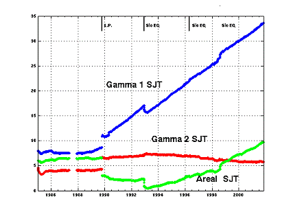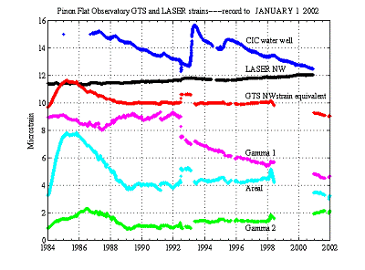 Californian Stability Data A second example is shown in the figure below by direct comparison with the Pinon Flat Laser Strainmeter. Only one component (NW-SE) of the LSM is optically anchored (the other two components are insufficiently stable for the comparison). A NW-SE strain is computed from the measured GTSM data. This GTSM inferred NW-SE record (red trace below) mirrors the laser strain record (black trace) after the grout curing is complete, from 1988 to 1998. This is a clear indicator that the borehole strain is comparable in stability to the optically anchored laser system. Note significant offset for Landers earthquake. The shift in 1993 was identified by Wyatt as caused by pumping at a local water well.. The planned comparison between the GTSM and the Sacks–Evertson dilatometer at Pinon could never been performed because all three dilatometers at the site failed within a few years of installation.