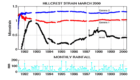 Strain data from Hillcrest site in eastern Australia – a tectonically inactive region. This performance claim has been demonstrated by installation of a standard instrument in a relatively stable tectonic region in Australia to directly address this issue. The instrument was installed in a granite environment north of Canberra in 1991 and the record is shown above. The shear strains over the entire record show approximately 200 nanostrain drift/variation over the 11 years or less than 20 nanostrain per year even during the grout curing sequence (1991 to 1993). Areal strain fluctuations over that period vary by up to 600 nanostrain, and as expected show mild correlated with the monthly averaged rainfall plotted at the bottom of the figure. The offset in areal strain during 1993 is an artifact produced by an experiment with an alternate uphole measurement system. The associated rainfall record demonstrates well the general insensitivity of the GTSM to rainfall, with the increased annual average rainfall in the late nineties influencing the areal strain record by a few hundred nanostrain over five years.